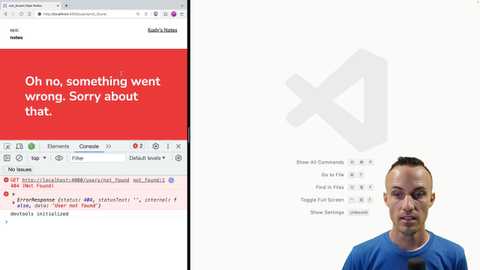 01:12 And so yeah, whatever we put in here, that will show up right there. And yeah, that's actually a much better error message. And of course, this will still work if we have those throw new error right here. Now we're going to, because that isn't a 404 or anything like that, it's just like some error