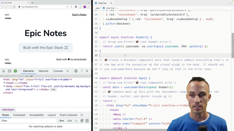 00:00 So instead of trying to move stuff out, this will actually be easier if we just call this document. And then we can have a new thing, export function app. And this is our new app component. And then we just move stuff into the app component that can't be in the document. For example, you cannot use useLoaderData