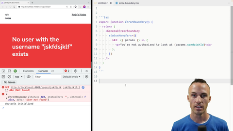 00:00 Kelly, the co-worker, has come in clutch and made us a really nice abstraction for our error boundary. So now we have this general error boundary that we can use to render errors all over the place in all of our routes, because this is a pretty common thing that you're going to want in your routes. And we want it to be consistent. We want it to be easy to do.