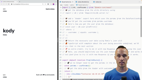 00:19 So we're going to use the params from data function args, and that's coming from RemixRunNode, and that is a type. We'll just stick that up there. And then we're going to take MartyTheMoneyBag's suggestion to get our user. So again, you're not really here to learn about how to use this DB abstraction,