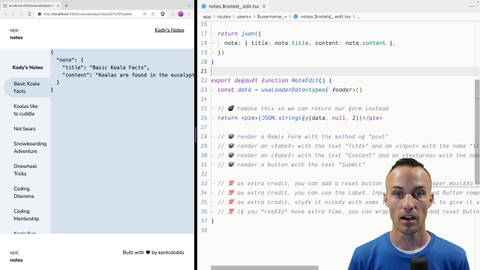 00:00 Our note edit route is not really doing too much. We're just rendering the data, so let's make it render a form instead. We're going to return a remix form, so capital F-O-R-M, and that's going to come from Remix Run React. Yes, we do want method post, so we're going to do all caps post here.