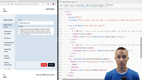 00:00 With our form all set up, we can now start handling these POST requests. So our loader actually handles all the GET requests, and then our action handles everything else. So in particular, it handles these POST requests. So forms can only be set to GET or POST, as far as the browser is concerned.
