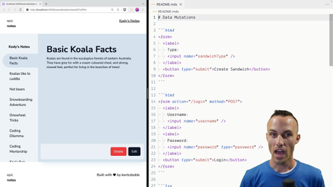 00:18 and it will apply, and it'll be awesome. You'll also be able to delete notes, and that will also work. And that's a form submission that we're going to be doing. That is just a single-button form submission. So how is this going to work? Well, first of all, the way the web platform works