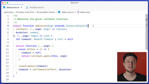01:42 failing the test. In this exercise, your task will be to complete the existing test suite for the debounce function by mocking timers, because what you want to do effectively is somehow advance the time by this particular debounce window so you're able to assert on the debounce function reliably.