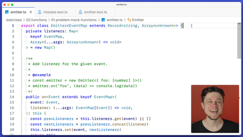 00:00 In this exercise, you will be testing a class called Emitter. It looks a little bit like Event Emitter from Node.js if you used it before. So let's take a look at how it works. This class has two methods. One of them is On, which accepts the event and a listener function associated with that event, and just stores it internally in this listeners map.