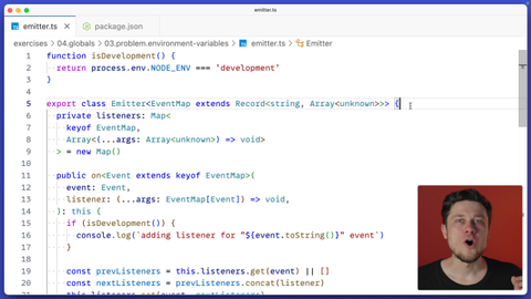 00:00 One of the common global dependencies is a dependency on the environment, specifically on the environment variables. Here, let me show you. We've got this emitter class here that looks extremely similar to the emitter from the exercise block on functions. But this emitter