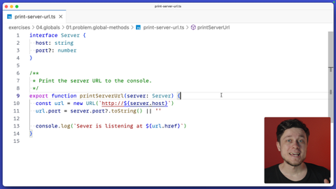 00:00 Here you have a printServerUrl function that accepts a server and then constructs a URL from server's host and attaches an optional port to that URL, so that it could print to the console that the server is listening at a particular address. So the main purpose of this function is precisely this console.log call.