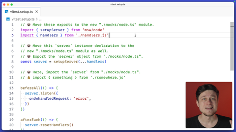 00:16 called node.ts and paste them here. Since we also use handlers, let's move them from the root to this newly created mocks directory. That's it. And the last thing remaining is to export this server variable so we're able to reference it whenever we need. In fact let's go to vtest setup