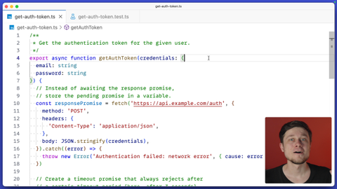 00:18 Well, in that case, it'd be nice to abort it, to time that out. For that, I've refactored our function to introduce a timeout promise that simply rejects with a timeout error, up to three seconds, and then I introduce a promise race condition between the actual response promise and the timeout promise.