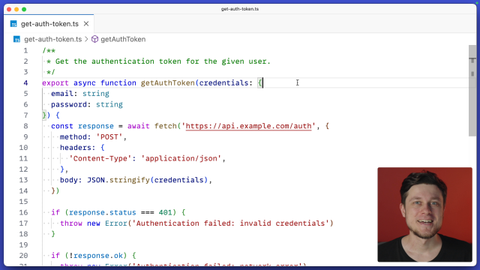 00:00 Let's learn how to set up MSW together, so feel free to follow me while you're watching this video. So here we have a getAuth token, and the purpose of this function is to fetch some authentication token from somewhere, to be specific from this made-up server URL. And then it has some response handling, some basic error handling, and in the end reads responses.json and returns the