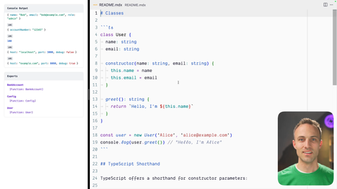 00:14 This is the syntax you start with class. You give it the name and then you have your class body. You have properties that, each user is going to have. So our user will have a name and email. And then you have this constructor that takes the, given name and email and sets that onto our instance of the user.