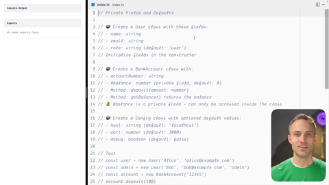 00:00 Okay. In this exercise, we're gonna talk about private fields and we're also gonna do some more with the default stuff. So you're gonna, create a user class and a bank account and you don't want the bank account, information to be public or anything. So, you're going to, take that and make it a private, property. It's got a special syntax for that.