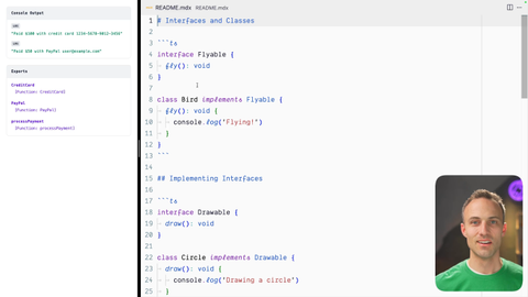 00:19 Hooray. We're just gonna console log because I'm not gonna program a bird. Come on. But, yeah. Then we can implement those interfaces with, the implements keyword and you can implement multiple interfaces.