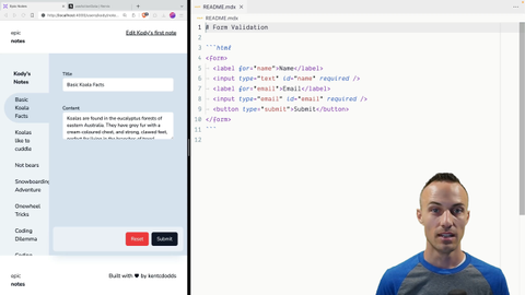 00:00 Let's validate some stuff who will validate these forms So when you're all done we will get this nice validation logic when there is no JavaScript or when the JavaScript is slow and Then and that's like built-in browser behavior. And then when we've got JavaScript, we'll have our own custom job or