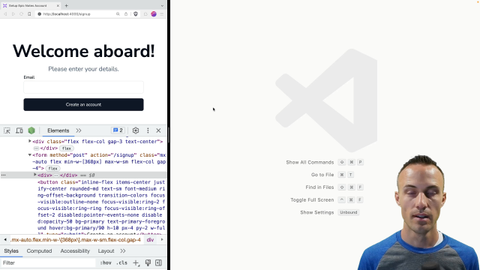 00:00 Let's go to our sign up form right here and we can get rid of this We're going to be using our form data and in our sign up route. We want to render a hidden div Within which we will place our label and our input. So let's make a div and