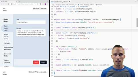 00:36 Given schema and that is one of the things that conform can do for us We're going to bring conform in not just for this I don't think it would be worth it if that's all it did It also gives us a lot of really awesome utilities for our UI as well And so we're going to bring in conform We're going to apply this server-side logic to it and then in future steps
