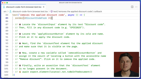 00:00 To cover this new use case in tests, let's reproduce it first. So here I render the discount code form. Next, let's get our discount input. Get, so page get by label text, discount code. Let's enter some value.