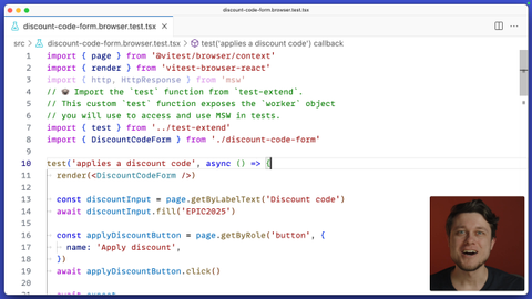 03:12 but also that the warning is displayed for the user. And in a very similar manner, let's complete another test case for an error. Basically, we need to make sure that our component is able to handle network errors when applying the discount code fails. Just in the same way, let's access the worker here in the fixture, applied an overwrite worker.use,