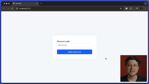 00:00 In this exercise block, you'll be testing a new React component, and it looks like this. It's a discount code form. It consists of two elements. It's the input for the code and the button to apply it. If you want to write great component tests, you have to model them after the user. And this means finding the elements on the page the same way the user would