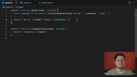 03:07 So, both tests are now passing reliably, even though I'm recording on Friday. The greeting for the John will still mention Monday, because we introduced the mock for the date constructor that will always return Monday. And now, our test for the greet function passes the golden rule of assertion,