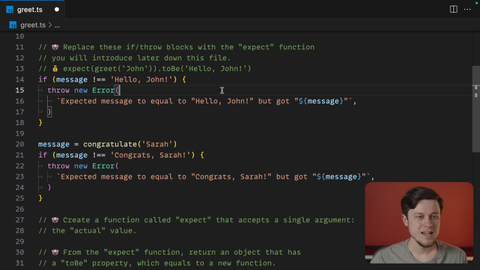 00:59 If those are not the same, we will throw a meaningful error message to let us know. As the next step, let's refactor the existing tests. So for John, let's just use expect greetJohn to be helloJohn. And for Sarah, we will actually drop this need to have the additional message variable,