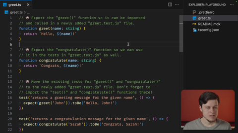 00:20 With this, we can now import them in the test file from the source module. Great, now the problem is with test and expect. Those don't really exist, but we don't wanna import them explicitly because we will be using them a lot in all of our tests. So how about we make them global?