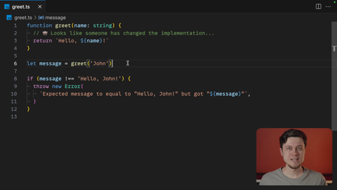 00:36 In this scenario, it's calling the greet function with the right input and records the output, the greeting message. And then finally, the assertion phase does this comparison between the actual and expected results and throws an error. In this exercise, you will be working on rewriting this test to make it more declarative, isolated, and also readable.