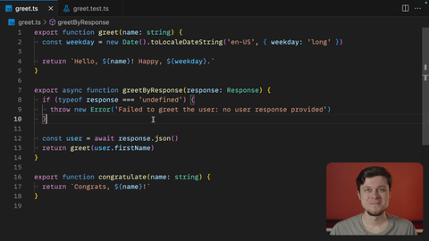 00:00 To make a greetByResponse function more robust, we're adding a check here for the cases when the response is not provided, we will throw an error letting whoever is using this function know that they're forgetting to pass in the response. Now let's write an automated test just for this scenario.