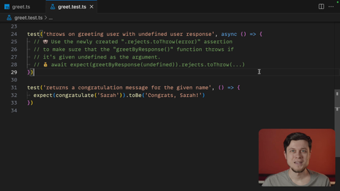 00:48 important to wrap this in a promise so we can properly evade that rejection when it's happening. So now when these types are defined I can see that TypeScript is kindly screaming at me that I need to implement them as well. Let's do that. We will add the rejects property here with a toThrow method and let's implement it right here. So the first thing that we need to do is to