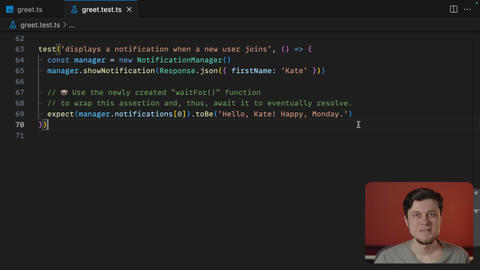 00:00 To write this test reliably, we need a utility function called wait_for that will allow us to await a state transition when a greeting message is pushed to the notifications array. So let's implement this function. We have the most of its implementation right here, so I'm just going to use it.