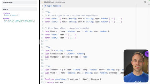 00:00 Welcome to the types aliases exercise. In this exercise, you're gonna learn about making type aliases. You've done a little bit of this before if you've done it in some of the previous workshops, but I wanna formalize this and make sure that everybody's on the same page with what you can do with type aliases. So, here's what you have to do if you didn't have type aliases where if you wanted to type these, users as something specific, you'd have to duplicate yourself. Kind of repetitive.