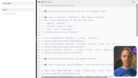 00:00 Alright. Let's talk about discriminated unions. We're going to make a type for API responses. And here, the AI is saying, hey. This can be a a series of objects with the the union, here.