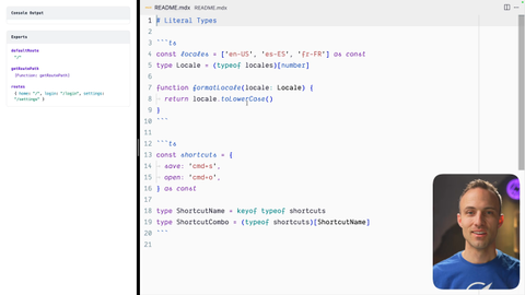 00:00 Alright. Welcome to the literal types exercise. I'm very excited about this one because I use as const all the time. And I really, really like deriving types out of the variables that I'm creating for my run time. So, here is an example of using as const and type of and, selecting different types.