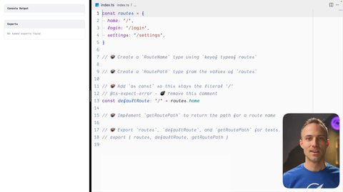 00:00 As cons can also be used to help us identify a single source of truth, that being the code rather than the types. And I really, really just love deriving my types from the source code. And so that's what we're gonna be doing in this exercise with as const. We did a little bit of that in the last exercise in the last exercise step, I should say. In this step, we're gonna be doing a bit more of that.