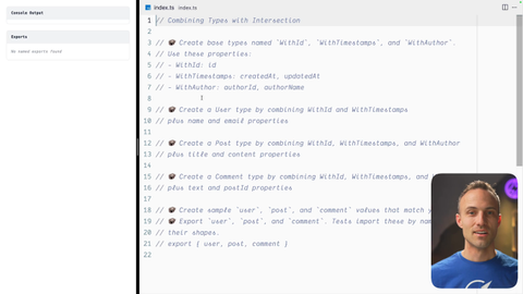 00:00 All right. In this one, we're going to combine some types using intersection types. That's a little ampersand thing. So let's jump into it. I do this all the time.