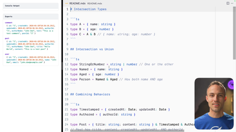 00:31 This is one or the other thing. The, the, intersection type is both of those things, so name and age. So, you can actually, combine multiple things in this way as well. So here's this one and that one, and then here are the my specifics, and here are the extra other things, that, can be added on to this. So, yeah.