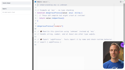 00:00 Okay. So here we have this dangerous process function that accepts a value and it's set to any. So here's the funny thing about any. You literally can do anything with any and TypeScript is totally fine with it. It's effectively saying, like, I don't, I I don't wanna use TypeScript.