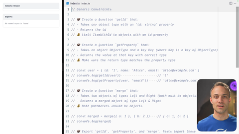 00:00 All right. Let's jump into this. So we've got our, first one. We're gonna make a create or get ID. It's a very, simple function that is going to take an item, and, we're gonna call it item, the type item, and it's gonna just return the ID property.