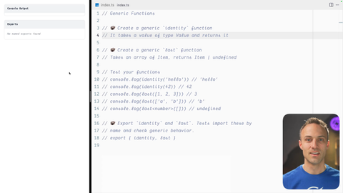 00:00 Okay. Let's jump into our generic functions. We're gonna take, or we're gonna first create an identity function. So, literally all an identity function does is it accepts a value and then returns that same value. Like I said, seems kind of useless, just like this return value, or return type is useless.