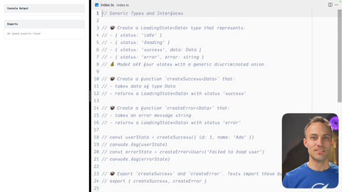 00:00 Okay. Now, you can make types that are generic as well. So not just functions, types can also be generic, and we've got a couple of examples in here to show you how that syntax works and when you would do that. So let's jump into this exercise step and we'll see you when you're finished.