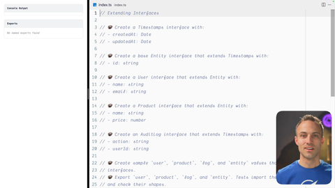 00:00 Alright. So now we're going to extend interfaces. So just like with types where you have the little ampersand to, do you know, combine different types together to make a single type, you can do a similar thing with interfaces using the extends keyword. So we're going to have you do that in this exercise, and then we'll go through it together when you're done.