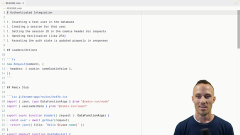 00:00 Okay, we're at the integration level and we want to do authenticated requests. And so there are a couple of things you have to do to make this work. All of our loaders and actions are talking directly to a database, and you could mock out that database if you want to. There's definitely some situations where that makes sense, but not very many.