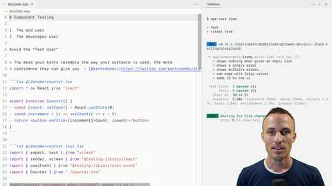 00:00 Okay, who's ready to learn about component testing? We're going to be testing components. It's going to be awesome. So as part of this exercise, I want you to think about two users in particular. The end user who's going to be clicking the buttons of the components that you're rendering or just visually seeing,