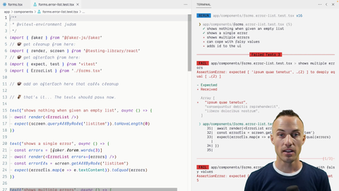 00:00 So, Kelly finished the test for us, and feel free to delete these tests and write them yourself if you want to practice, but they're not working. There's a problem with them, and it has to do with the fact that we're mucking with the DOM and not cleaning up after ourselves. So, your task is to handle the cleanup. This will be pretty quick. We'll see you when you're done.