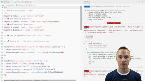 00:00 So, we've got a failing test. Let's take a look at what that failing test looks like. So, it shows nothing when given an empty list. That works. Shows a single error, and then once we say shows multiple errors, then that's a problem. Now, you might think at first glance that, okay, so this test is the one that has the problem. But check this out.