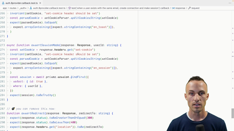 00:36 In fact, all of these could be a custom matcher that we can make ourselves. So your task is to make a custom matcher just for the assertRedirect assertion, and then update all the places where we're using assertRedirect to be expect response to have the redirect.