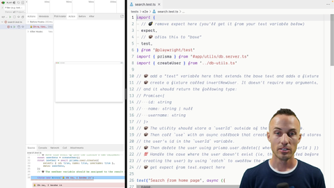 00:00 So we're going to be making our own test object. So I'm going to alias this as base. I said object. It actually is a function with object properties, like expect. So we're also going to remove expect here. And then we're going to say test.extend, or base,