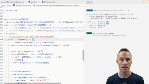 00:18 So, the trick is, we do have logic for what happens if we can't get an access token, if there's some sort of problem there, like maybe GitHub is down, or the code that was provided is invalid, or something like that. And so, we want to test that logic to make sure that never breaks,
