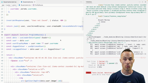 00:00 We've got another test that Kelly put together for us for the authenticated side of this, and it's not working right now. It's failing for us. And the reason that it's failing is because to determine whether the user that is viewing this profile is a logged in user, they're looking at their own profile,