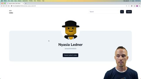 00:00 So here we've got our username route, and if we are not logged in, then it's just going to say when the user joined, it'll say their name, it'll have their avatar, and it will have a link to their notes. But if we log in as this user, and then go to there, then we're also going to get a logout button and an edit profile button.